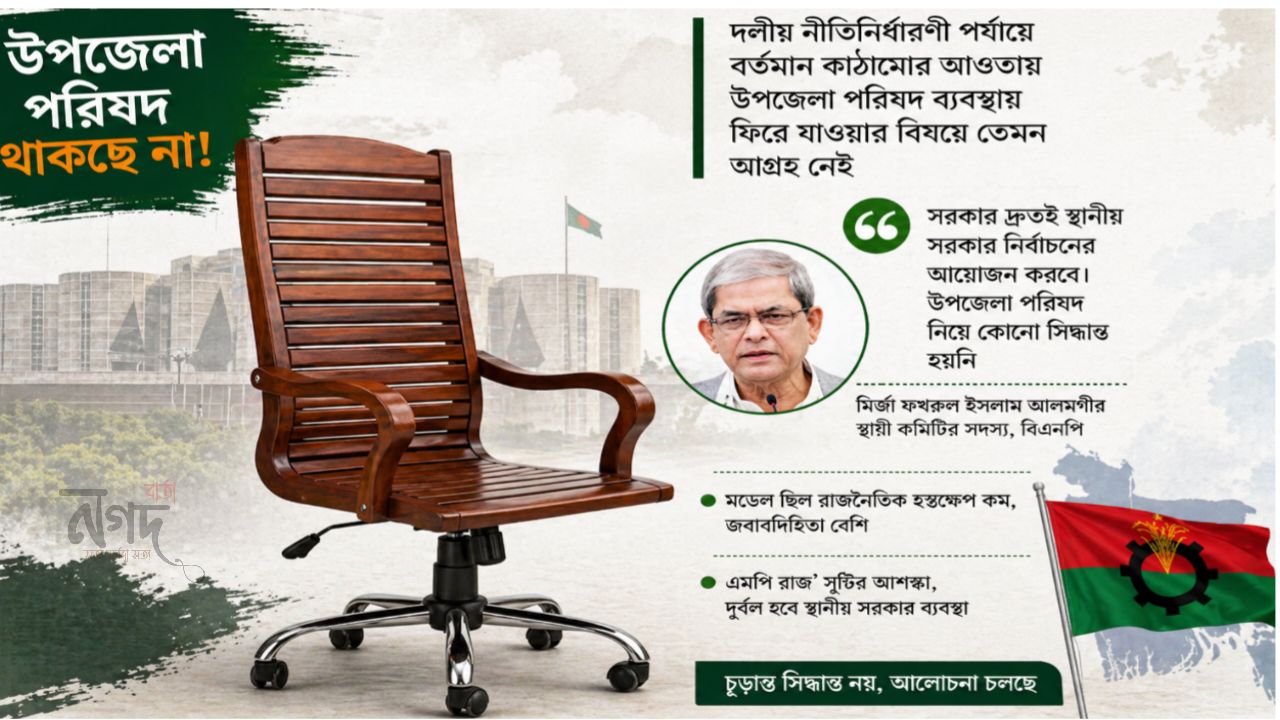 বিএনপির নীতিনির্ধারণী পর্যায়ের একাধিক সূত্র বলছে, দলটি স্থানীয় সরকারকে শক্তিশালী করার পক্ষে থাকলেও বর্তমান উপজেলা পরিষদ কাঠামো নিয়ে সন্তুষ্ট নয়। তাদের মতে, উপজেলা পর্যায়ে কার্যকর জনপ্রতিনিধিত্ব নিশ্চিত করতে হলে রাজনৈতিক হস্তক্ষেপ কমিয়ে প্রশাসনিক ও আর্থিক বিকেন্দ্রীকরণ জরুরি।